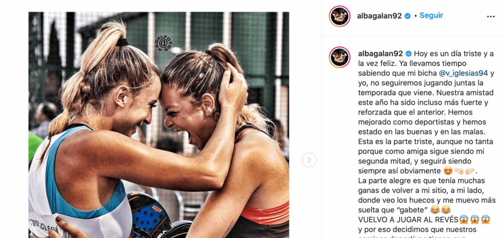 Alba Galán y Victoria Iglesias se separan. Así lo ha anunciado hoy la jugadora de pádel Alba Galán en sus redes sociales.