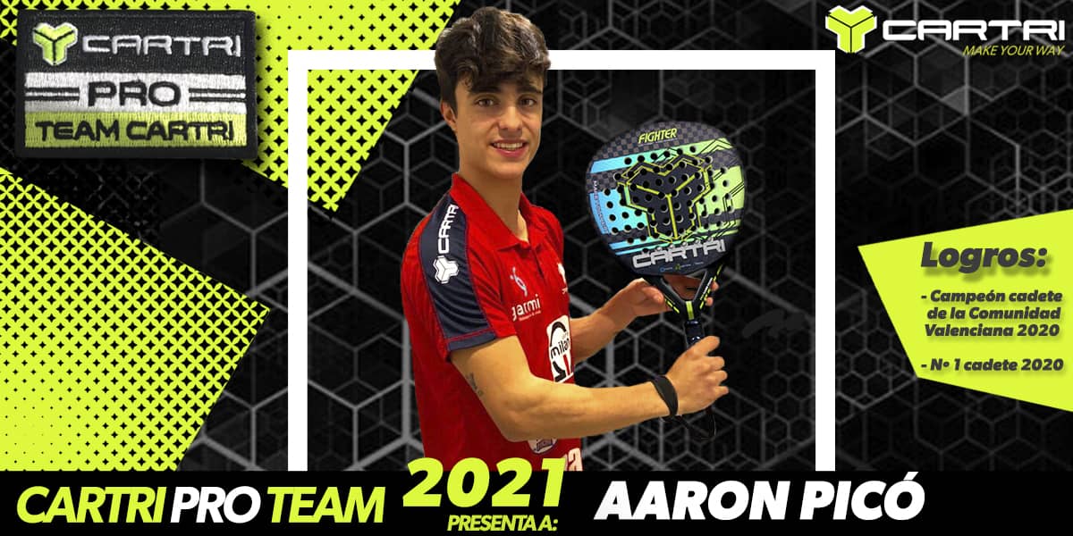 El joven Aarón Picó es uno de los talentos más prometedores del Team Cartri. Talento y juventud, se unen en una mezcla explosiva, que está dando mucho que hablar en el mundo del pádel.
