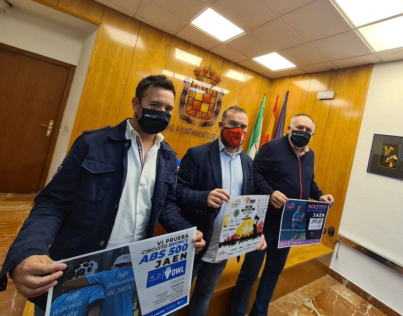 El concejal de Deporte de Jaén, Carlos Alberca, junto al delegado de la Federación Andaluza de Pádel en la provincia, Miguel Ligero; y el gerente del club Entrena 2 Pádel, Eduardo Rubio, han presentado hoy estas tres competiciones.