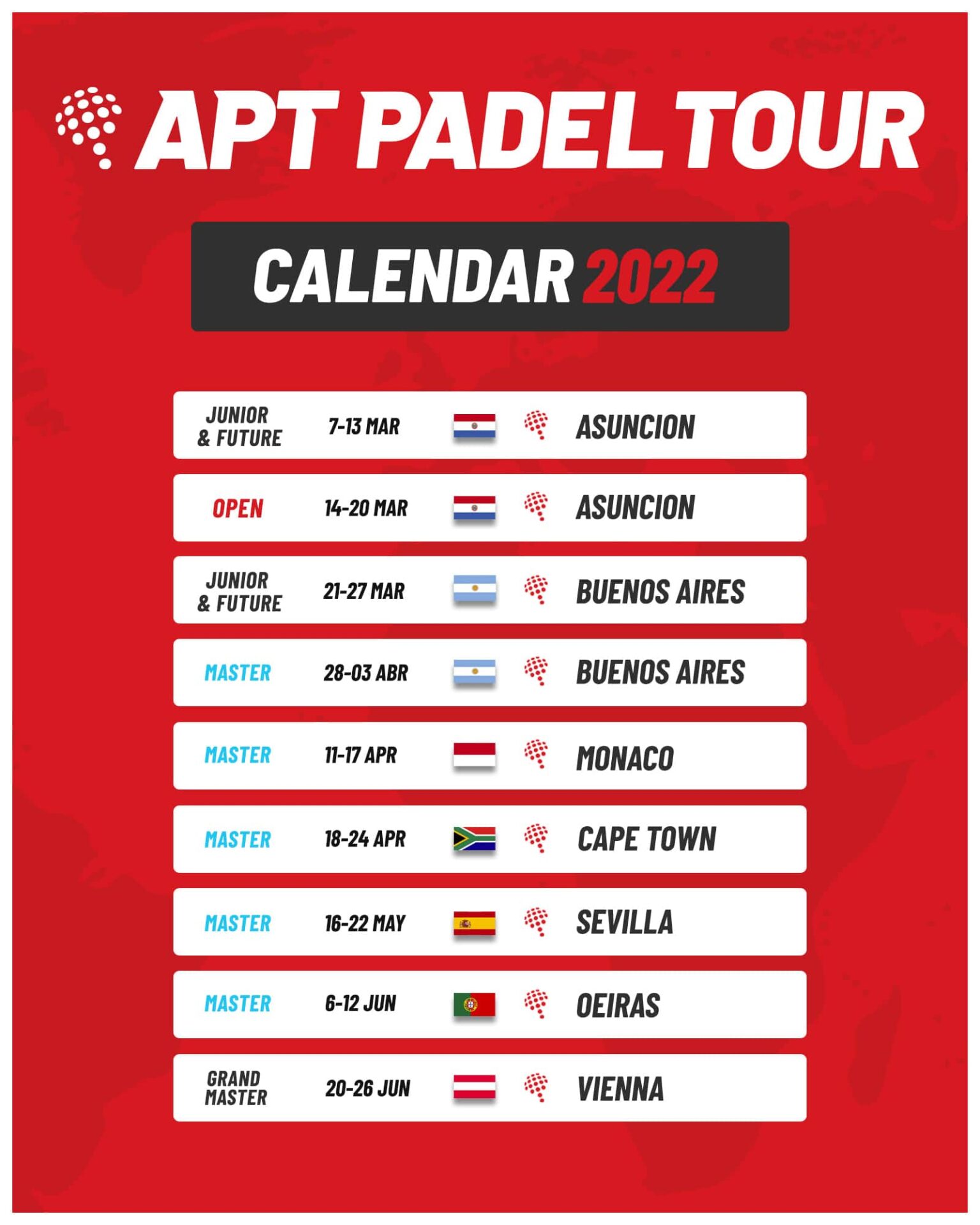 En junio, APT continúa en terreno ibérico para el Master de Oeiras, dejando para la semana del 20 al 26 el primer Grand Master en Viena, torneo con el culminará este apasionante primer semestre de pádel.