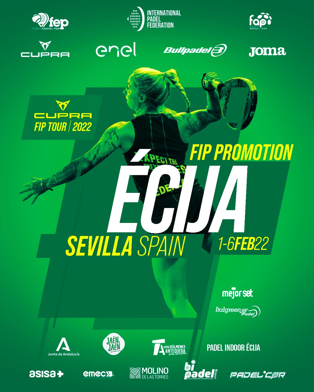 La primera prueba del circuito internacional CUPRA FIP Tour 2022 tendrá lugar este fin de semana en la ciudad sevillana de Écija. Este fin de semana Écija acogerá la primera prueba del calendario de la FIP. La competición se desarrollará en las instalaciones de Pádel Indoor Écija. Esta competición que comienza mañana viernes repartirá un total de 1000 € sin distinción entre el cuadro masculino y femenino. El viernes se disputarán los partidos de preprevia y de previa masculina. El sábado comenzarán los cuadros principales de hombres y mujeres, dejando para el domingo las finales. El municipio sevillano acogerá a más de 140 deportistas, entre los que Pepe Aliaga y Fran Guerrero ocupan la pole en el cuadro masculino, mientras que en el femenino las primeras cabezas de serie son Lucía Pérez y Marta Barrera. Este año en el circuito hay programados alrededor de 50 competiciones en una decena de países de cuatro continentes. Andalucía acogerá este año 8 pruebas internacionales, el FIP PROMOTION de Écija es la primera que tendrá lugar en el sur. Además de esta, habrá otras cuatro FIP PROMOTION, dos FIP RISE (Categoría superior) y un FIP PROMISES (del circuito internacional de menores) La próxima prueba del circuito Cupra Fip Tour 2022 será del 14 al 20 de febrero en Burriana, municipio de la Comunidad Valenciana. Sigue a AnalistasPadel y no te pierdas ninguna novedad acerca de todos los circuitos de la FIP.