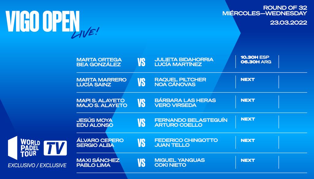 Tras Miami y Reus, llega el tercer torneo de la temporada regular de World Padel Tour con el Vigo Open. Como en los anteriores, el miércoles es el día elegido por parte del circuito para iniciar la retransmisión de un torneo que nos llevará por 5 intensos días de pádel hasta el domingo. Arrancaremos con los dieciseisavos de final de ambos cuadros, en los que podremos ver en la App World Padel Tour TV aquellos encuentros que vayan a la pista central, siendo un total de 6. 3 de chicas en el turno de mañana y 3 de chicos en el turno de tarde.