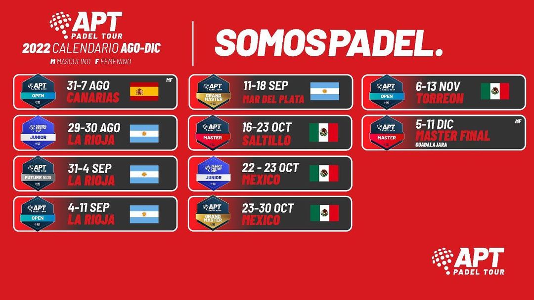 De esta manera, con las pruebas canceladas y las nuevas, el calendario final del circuito APT que finaliza en el mes de diciembre, queda de la siguiente manera: 4 pruebas en México y 2 en Argentina.