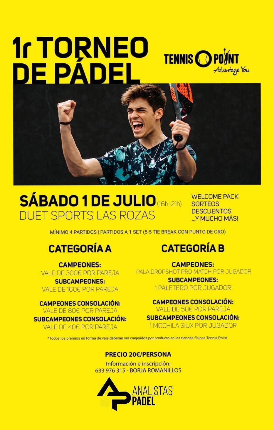 Aquellas duplas que no pasen de fase de grupos tendrán la oportunidad de redimirse en el cuadro de consolación, que también contará con premios. La gran final se disputará en la pista central de las instalaciones. Los jugadores tendrán la oportunidad de ganar sorteos y probar diferentes palas durante el torneo, ya que ‘Tennis-Point’ tendrá un servicio de test para aquellos que lo soliciten. El torneo tendrá dos categorías: A y B. En la primera, podrán competir aquellos con nivel 4.5 o superior, mientras que en la segunda podrán formar parte los que cuenten con un nivel 4.5 o inferior. El precio para apuntarse es de 20€ por persona. Si deseas inscribirte, ponte en contacto con Borja Romanillos a través de su teléfono móvil: 633 976 315. Consulta los premios de ambas categorías en esta imagen: ¡Sigue a AnalistasPadel y no te pierdas ninguna novedad acerca del mundo del pádel!