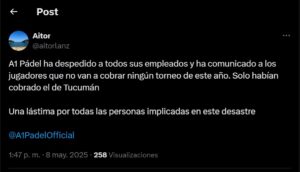 Un exdirector de A1Padel  afirma que se ha comunicado a los jugadores que no van a cobrar ningún torneo de este año. Solo habían cobrado el de Tucumán.